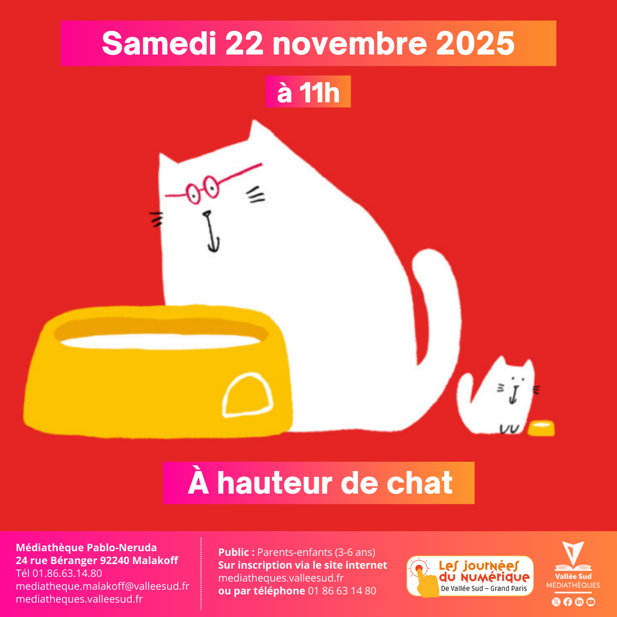 Un moment ludique et complice autour du livre Grand chat, petit chat de Sylvia Borando. Après une lecture partagée des aventures de Petit Chat et Grand Chat, parents et enfants prennent part à une exploration interactive sur tablette, pour aider les deux félins à progresser ensemble vers leur but.